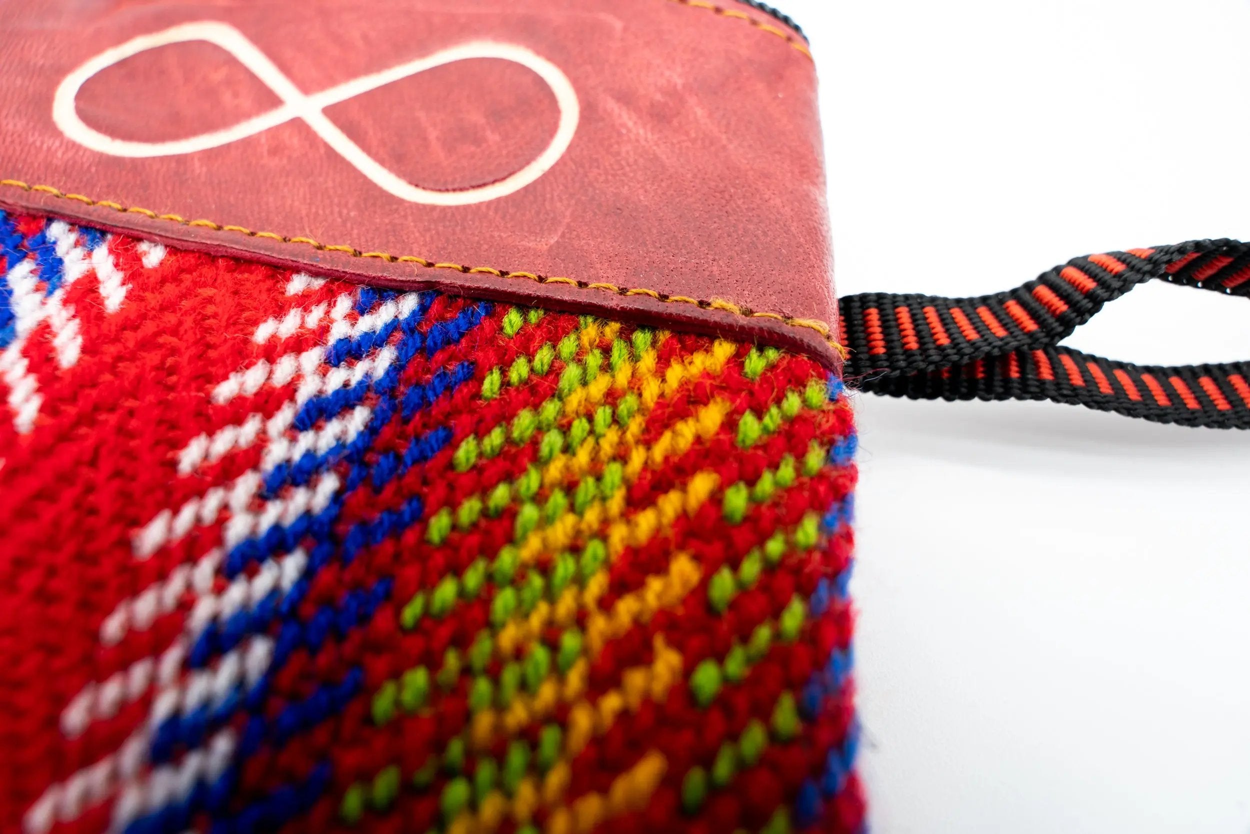 Purse with Louis Riel’s sash pattern as a base and on top the Métis symbol traced in red.