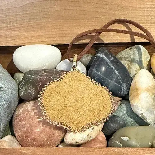 Beaded on deer hide and backed with buffalo hide on an adjustable leather cord . Beaded with size 11 Charlottes and Czech seed beads. 4cm tall.